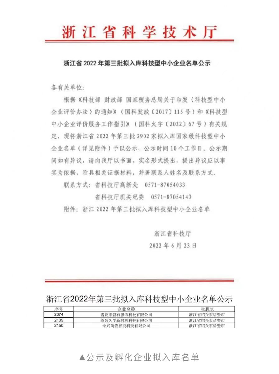 近日,浙江省科技厅下发了《浙江省2022年第三批拟入库科技型中小企业名单公示》。其中,位于诸暨市的绍兴久孚新材料科技有限公司入选。